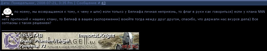 | а вот и чем закончилось обсуждение темы на сайте имморталнайтс Quote тему пора закрывать, ничево интересного нет в этой теме и соответстующей теме на сайте клана NNN, а еще лучше тему не закрыть, а кильнуть... как в ситуации можно здраво размышлять если не понятна с чего именно фсе началось, клан NNN даже сформулировать притензии к Белиафу не могут - значит их нет и эта тема ГОН со стороны клана NNN. В этой теме сплошной флуд, в теме у клан NNN тоже флуд Quote (Mult) подробности здесь - обратите внимание на дату темы и дату вступления к вам... какие это нах подробности???? сплошной флуд и мозготрепка! p.s.советую закрыть тему и перенести в архив,так как...